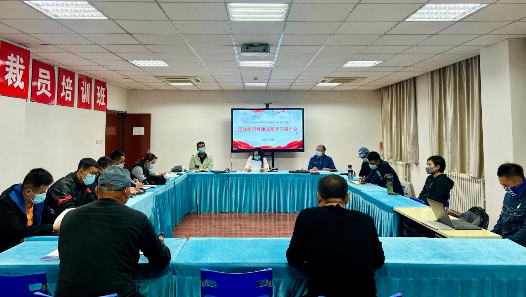 5月25日晚,足球学院在二号行政楼406会议室召开了师德法规学习研讨会,全体教职工参会,会议由党总支书记姜梅主持。