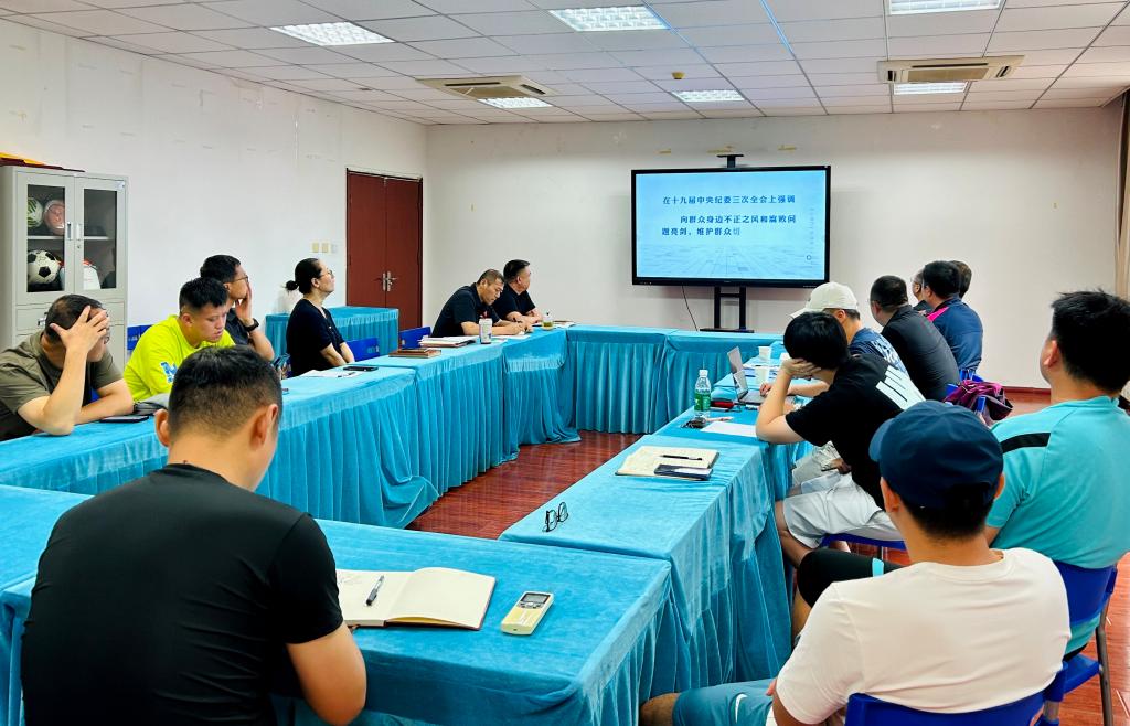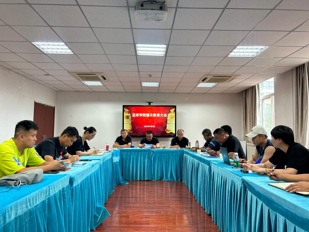 为认真贯彻落实习近平总书记关于党纪学习教育的重要讲话和重要指示精神,全面贯彻落实党的教育方针,落实立德树人根本任务,加强师德师风建设,7月3日下午,足球学院在二号行政楼406会议室召开警示教育大会,会议由党总支书记吕学宏主持,足球学院全体教职工参会。