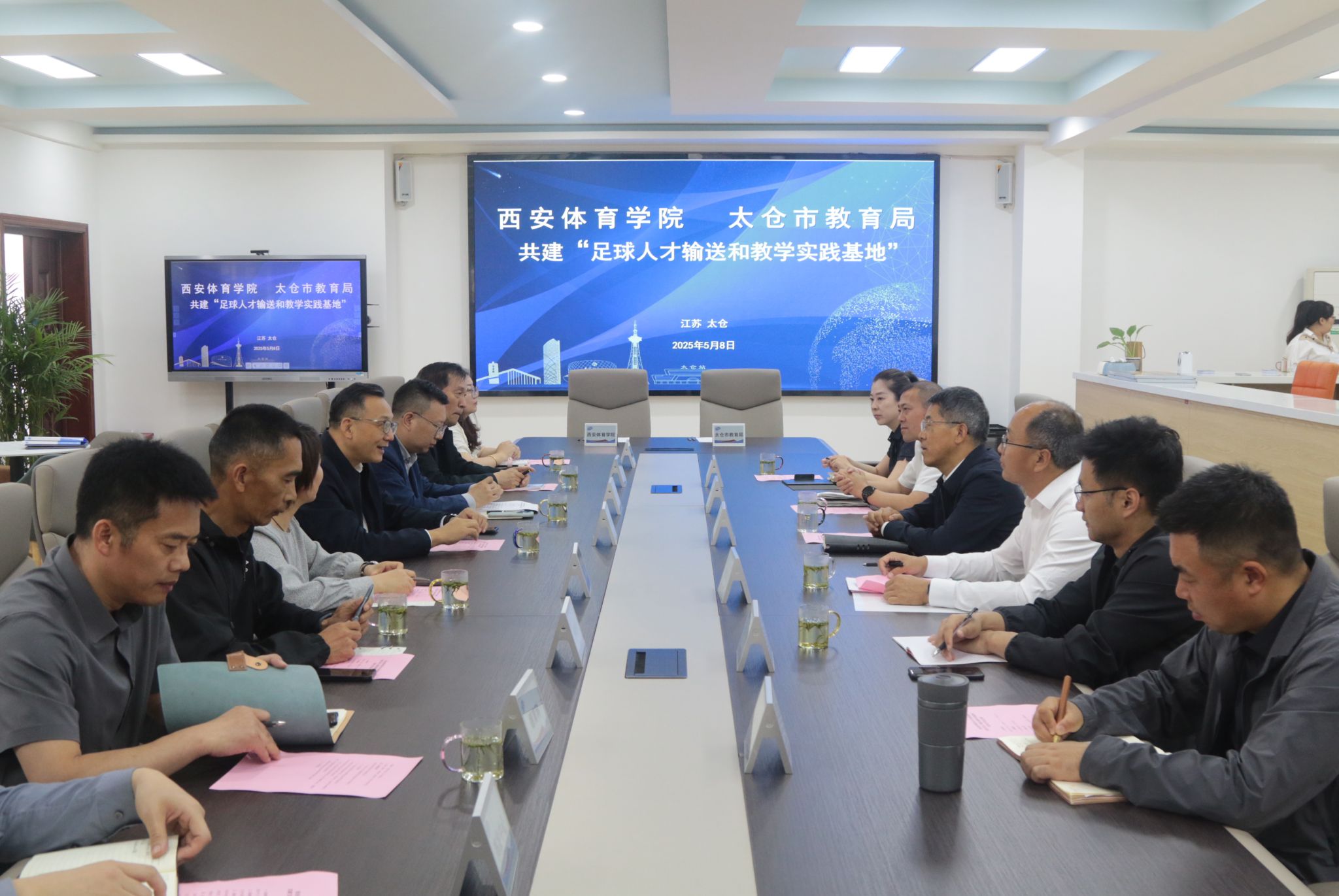 交流座谈会上,太仓教育局党工委书记、局长李广耀首先介绍了太仓市教育情况以及校园足球运动开展情况。太仓市教育局始终坚持体教融合,贯通式一体化足球人才培养体系,持续推动青少年足球高质量发展。接着,足球学院院长席海龙介绍了学院办学模式、师资队伍、人才培养、招生就业等方面情况,为双方合作奠定坚实基础。双方就今后提升当地中小学生足球专业能力、高素质足球人才引进、开展教师技能培训等内容达成共识,表示要进一步加强校地联动,实现资源共享,构建足球人才培养新生态。