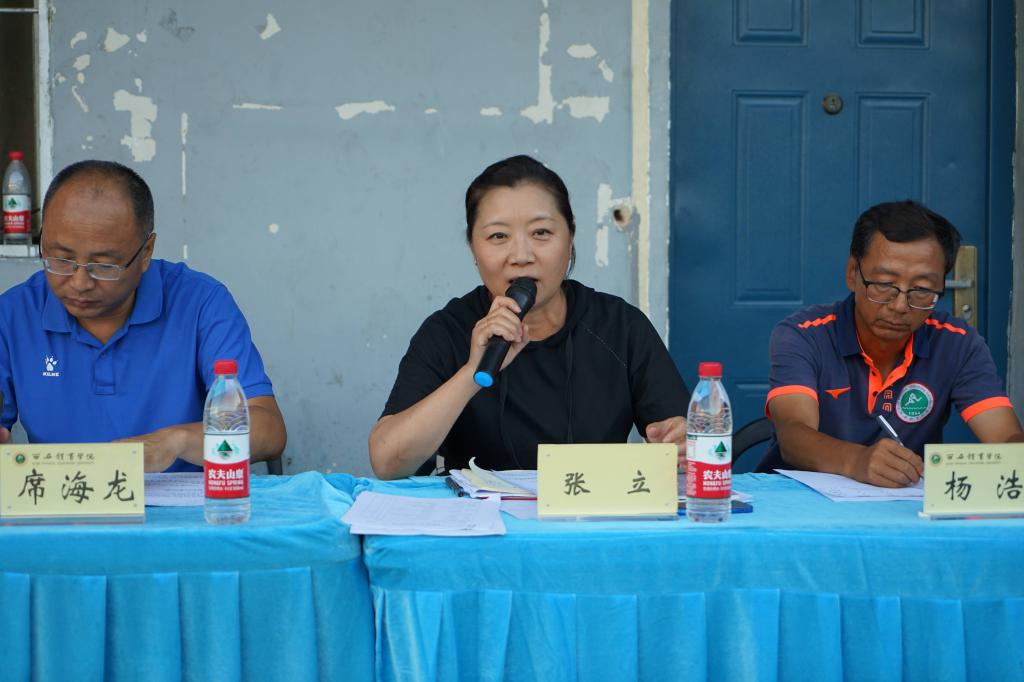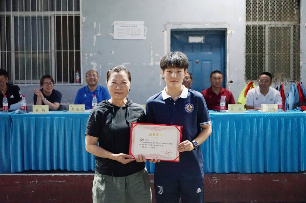 足球学院党总支书记姜梅为团体优胜奖2019级1班、2班颁奖