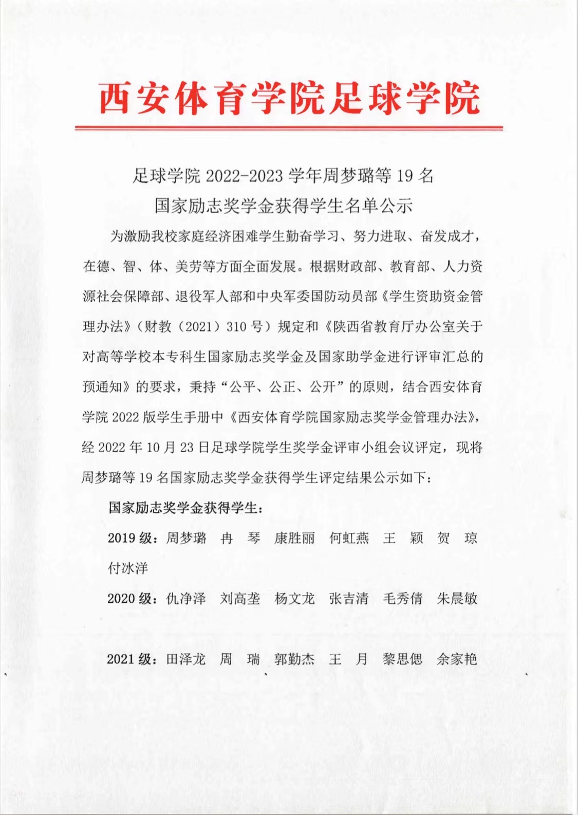 足球学院2022—2023学年周梦璐等19名国家励志奖学金获得学生名单公示